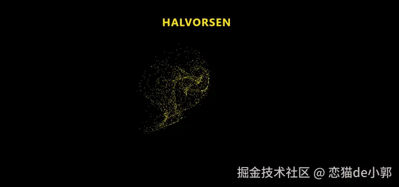 舉個例子, Halvorsen Attractor 的視覺效果是粒子在三個對稱的圓環之間穿梭,像一個糾纏在一起的三葉結,對應的公式邏輯大致為: