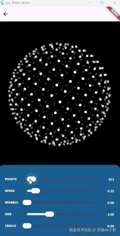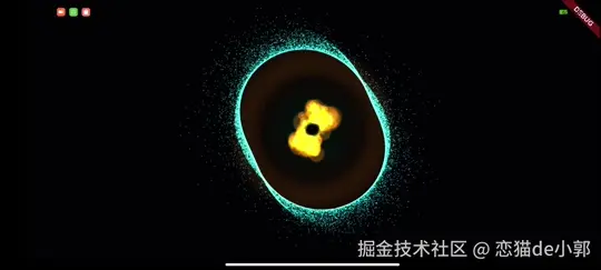 _resetSingleParticle(p) 之類的方法將它重置回原點附近的隨機位置,這不僅修復了 BUG,還讓粒子看起來像源源不斷地從中心噴湧而出。其實可以看到 Flutter 複刻出現的效果和原圖還是有點差別,其中最核心之一還是粒子的數量和計算的精細度,不過可以看出來,已經是非常不錯的效果了。